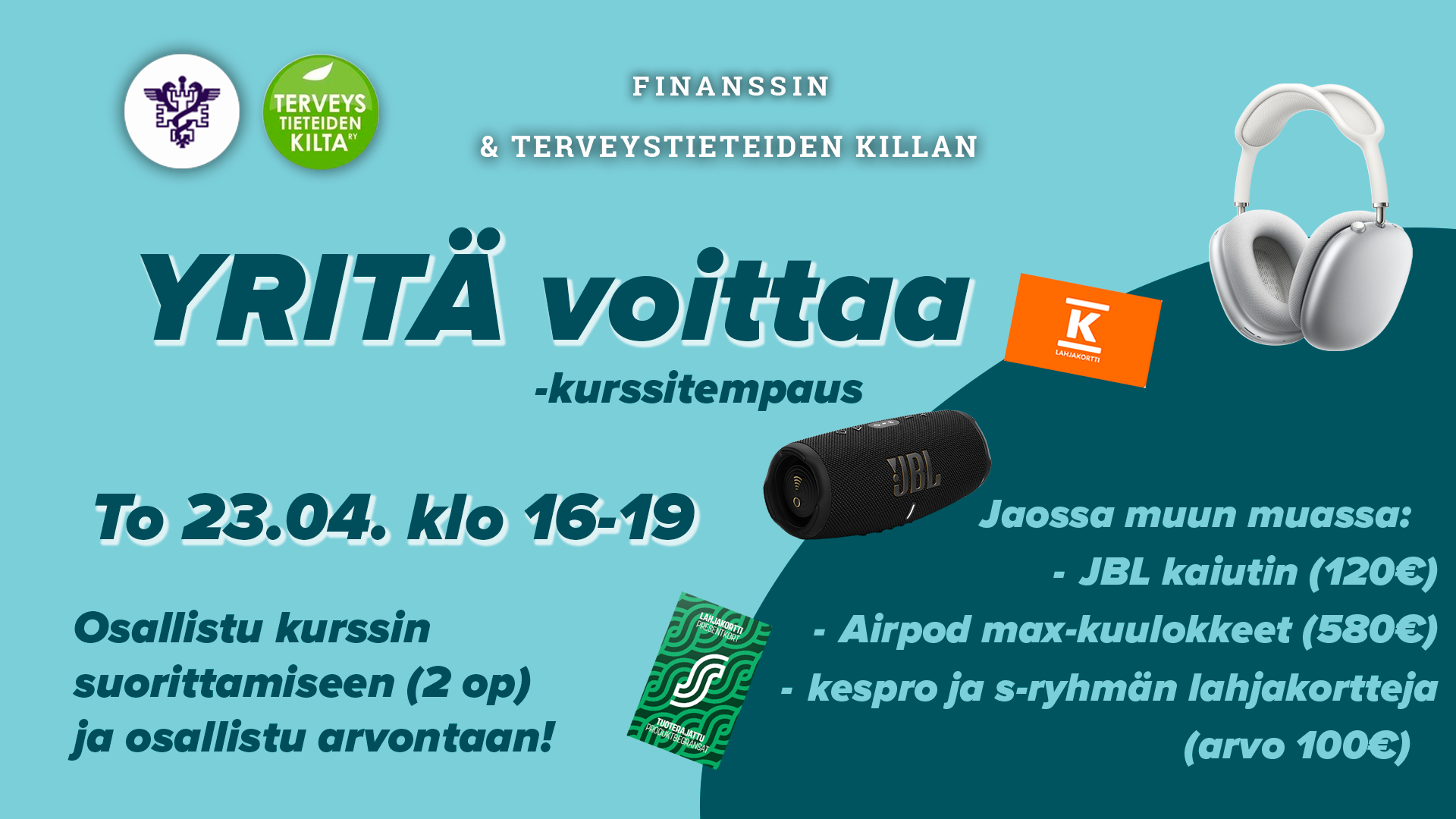 Kerää kaverisi kasaan ja tulkaa yhdessä suorittamaan helppo 2 op kurssi, jossa pääsette syventämään osaamistanne yrittäjyydestä ja johtamisesta HEI2MARKET -kurssin suorittaneilla on ainutlaatuinen mahdollisuus osallistua arvontaan, jossa palkintoina mm. Apple AirPods Max –kuulokkeet, JBL kaiutin sekä kaksi ruokalahjakorttia (à 50 €)!